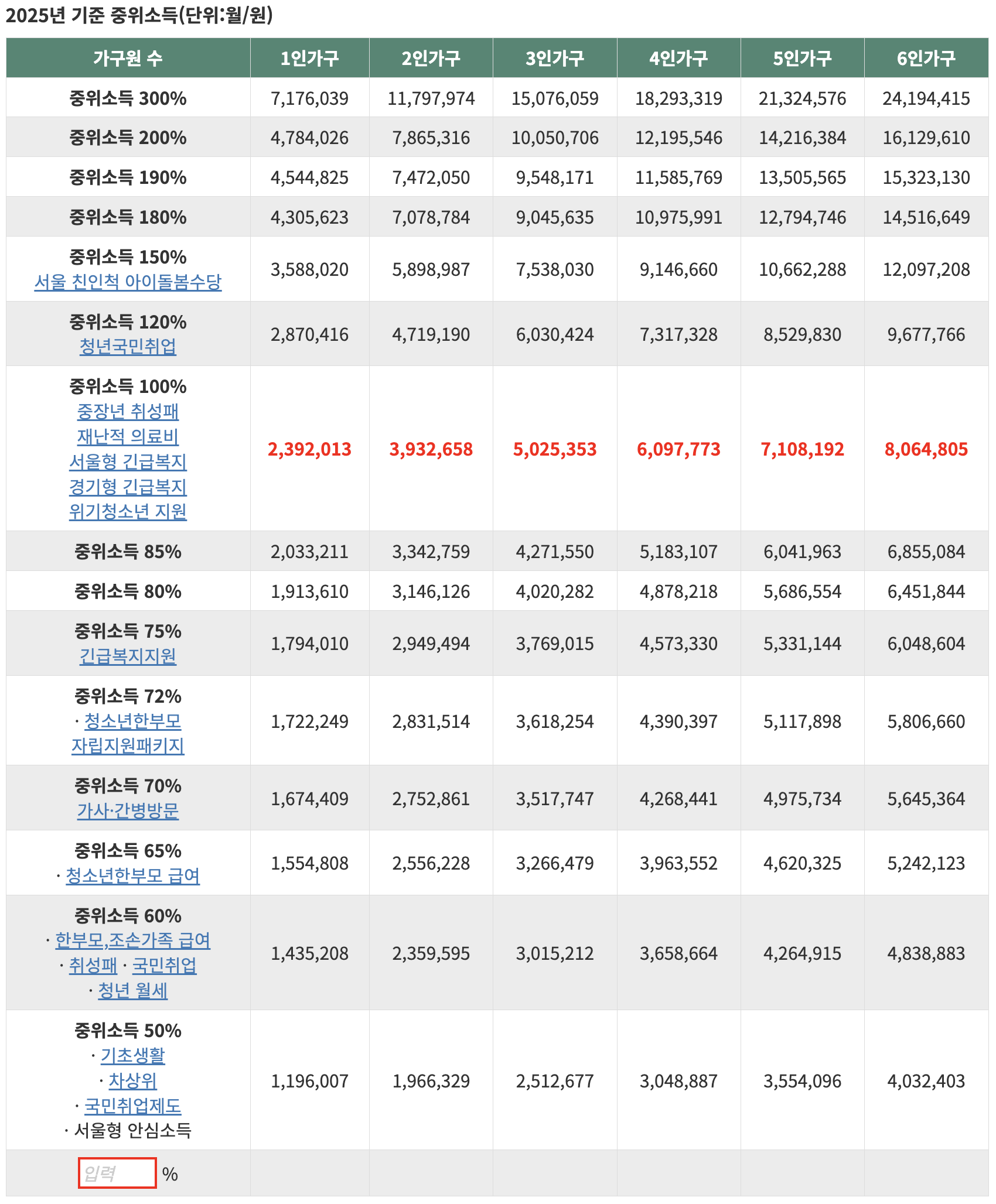 2025년 기준 중위소득표