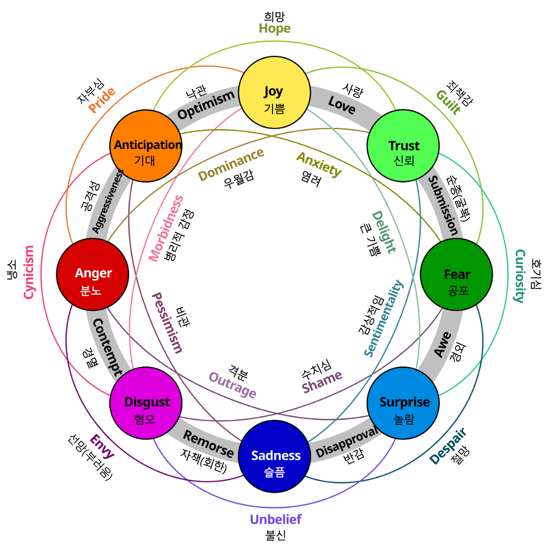 아래 그림처럼 하나의 감정은 반대되는 감정을 제외하고는 모든 감정과 조합될 수 있는데요, 각각의 감정이 다른 감정들과 상호작용하여 복합적인 감정을 형성하는 방식을 보여줍니다.