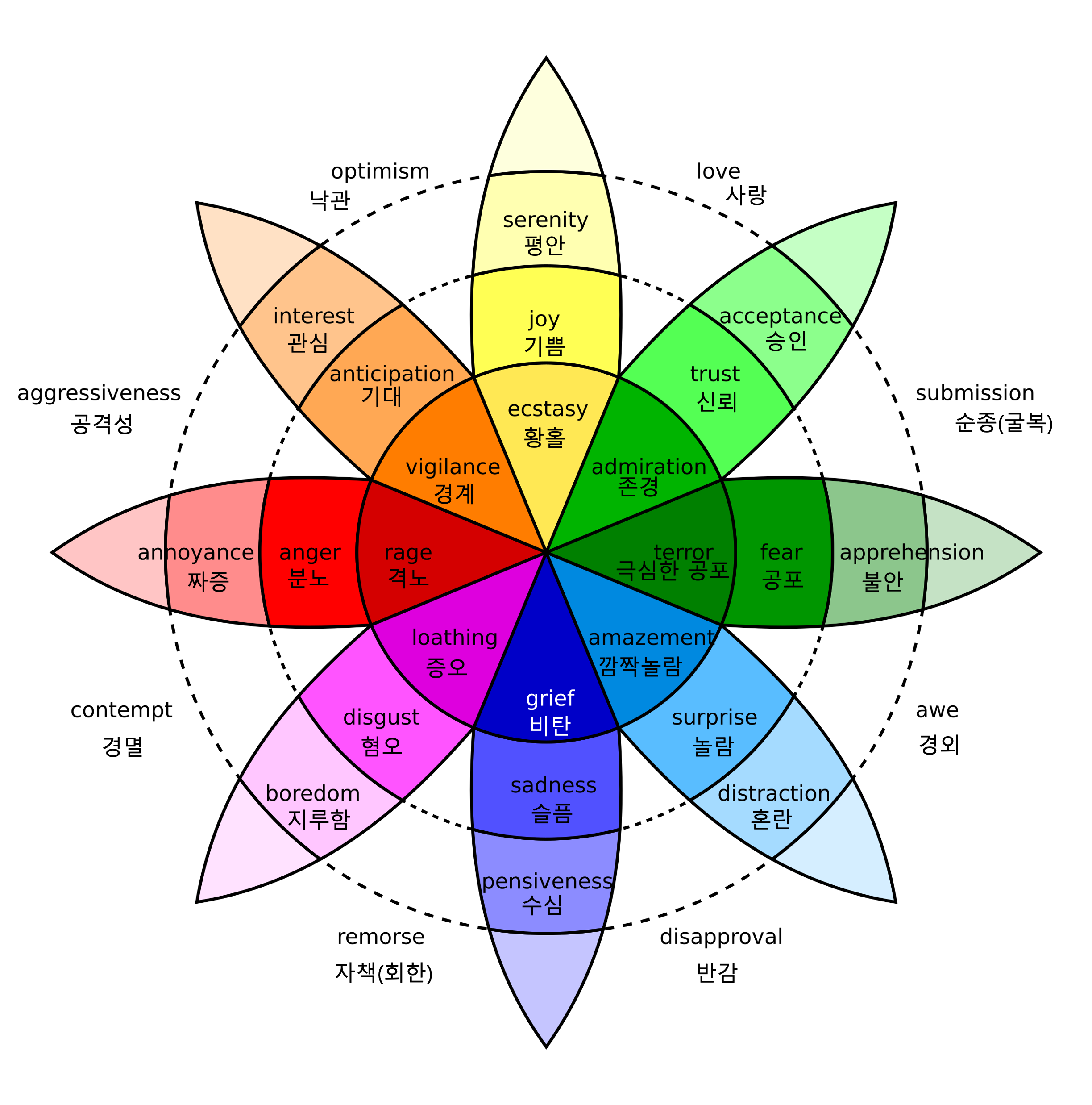 1980년 미국 심리학자 로버트 플루치크(Robert Plutchik) 박사가 만든 플루치크의 감정의 바퀴는 감정이 어떻게 관련되어 있는지 설명해주고 있는데요,