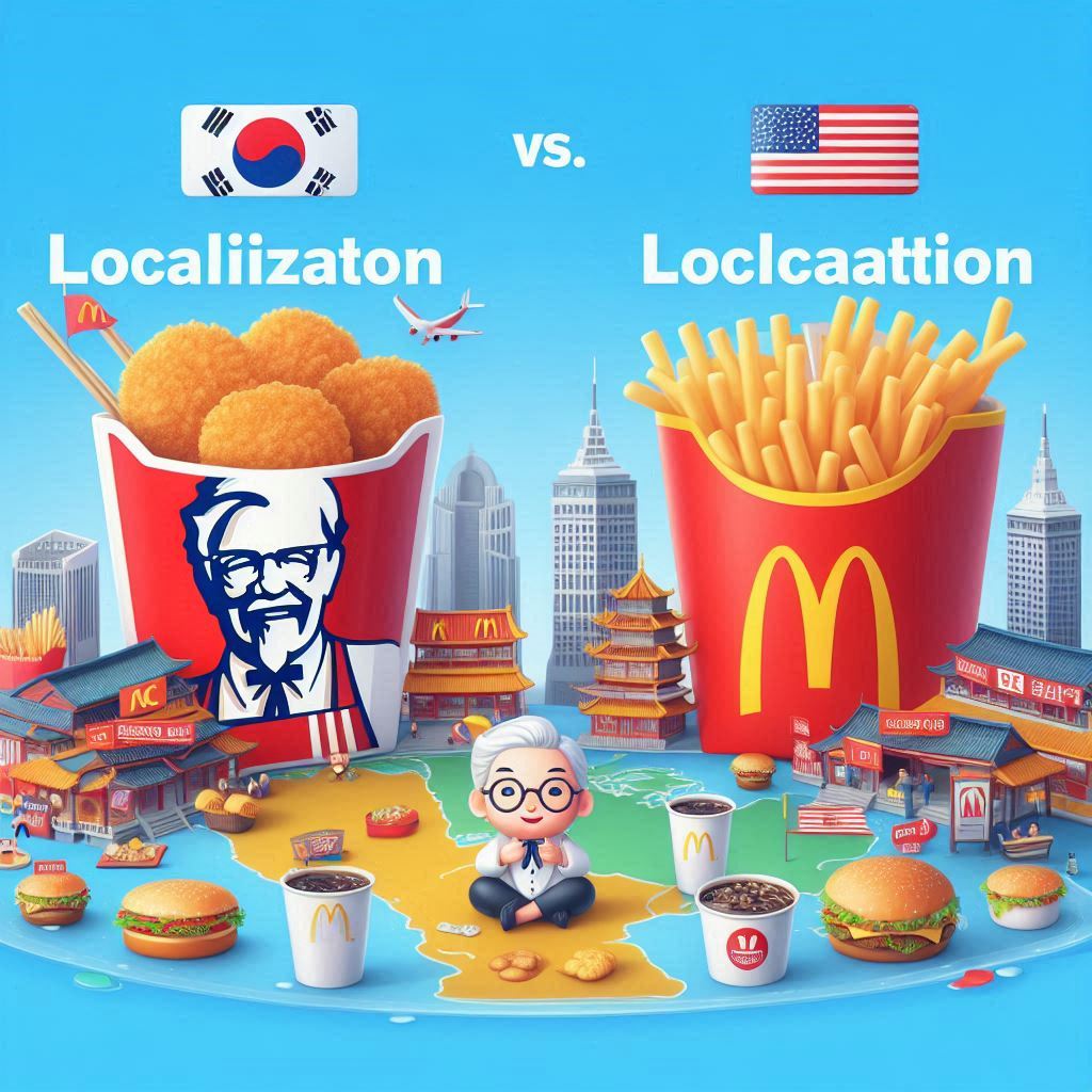 | 대표 사례 | KFC의 중국식 아침식사(죽, 두유, 유탕면 등) | 맥도날드의 현지화 메뉴 (불고기버거, 인도 무소고기 전략 등) |