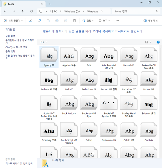 윈도우즈(Windows)를 클릭하시면 세부 창에 폰트(Fonts) 폴더가 보입니다. 폰트 폴더를 열어보면 PC에 설치되어 있는 모든 폰트가 보이실 겁니다.